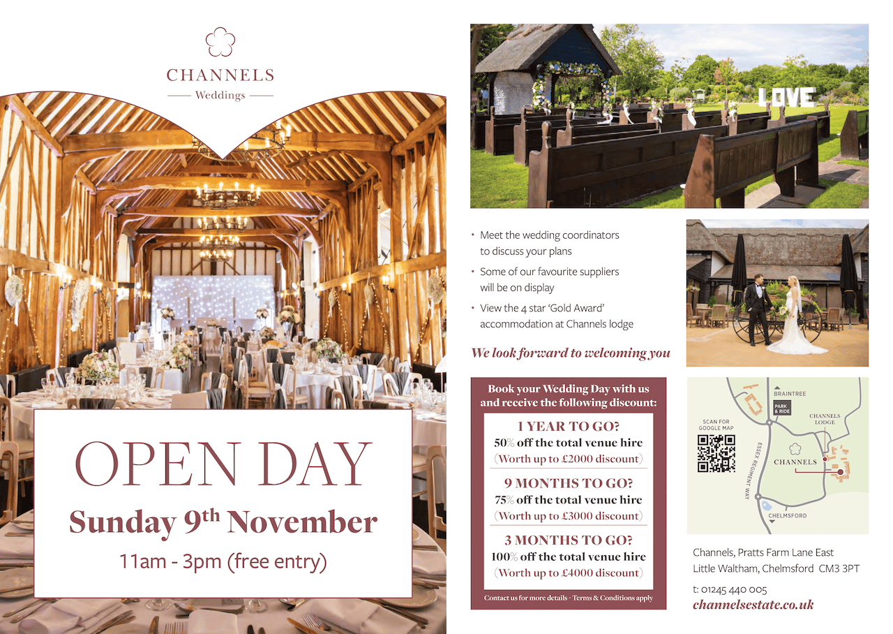 Outside, in the stunning ceremony garden overlooking the magnificent Essex countryside, the bride and groom can tie the knot under the pavilion while their guests watch the proceedings from the antique wooden pews. When it comes to reliving the memories made on this most memorable of days, the photographs taken in the tranquil Channels’ surroundings, with its extensive grounds, fountain, lily pond and avenue of mature trees, will provide a lasting memento to the special day.